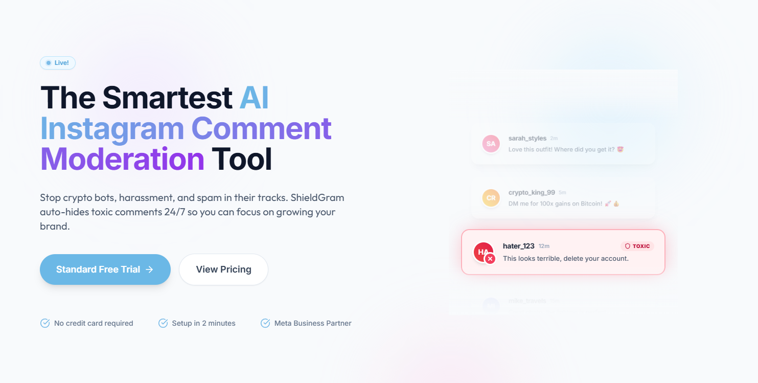 Instantly stop crypto bots, hate speech, and spam on Instagram. ShieldGram is the AI comment mode...