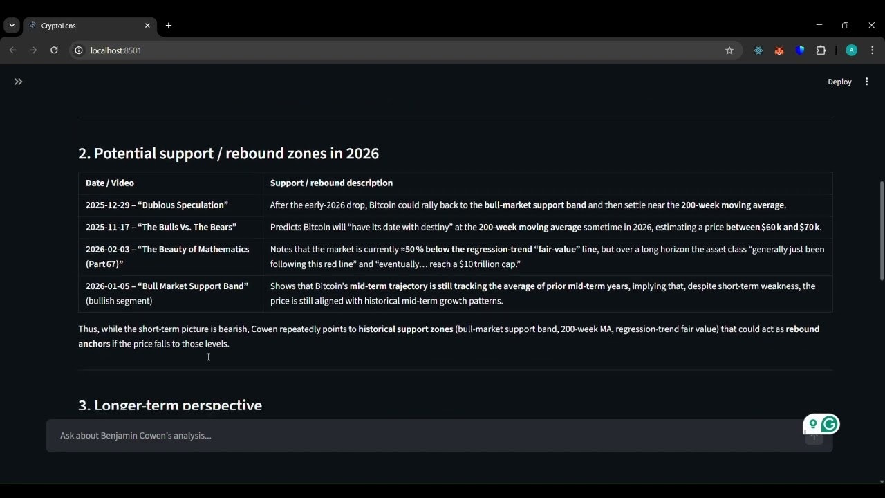 CryptoLens is an AI research agent I built to turn hours of crypto YouTube analysis into a search...