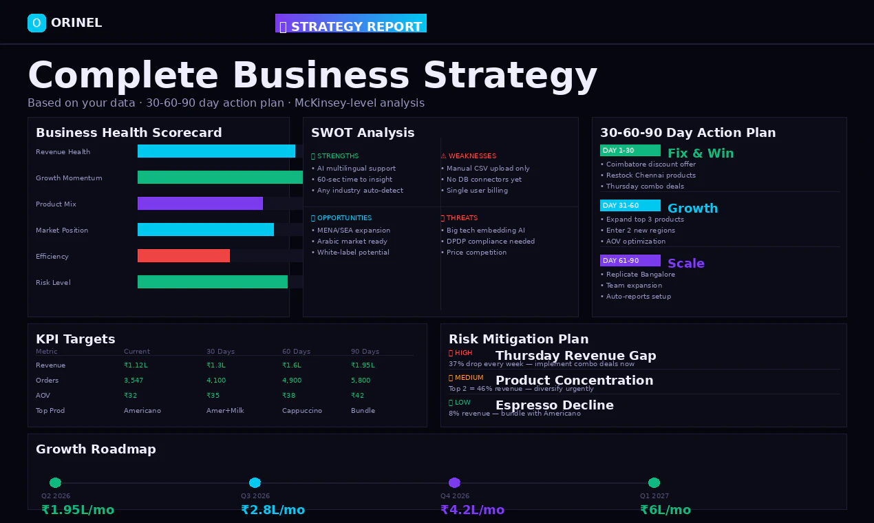 AI business intelligence that turns raw data into decisions. Upload any CSV. Ask in Tamil, Hindi,...