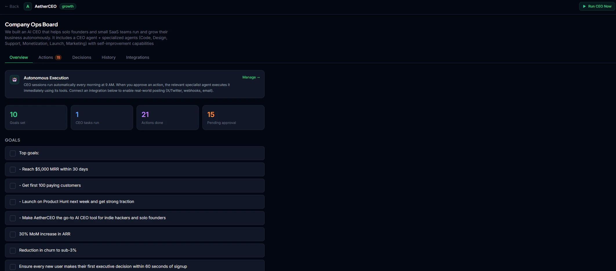 7 specialized AI executives — strategy, code, design, monetization, launch, marketing, and suppor...