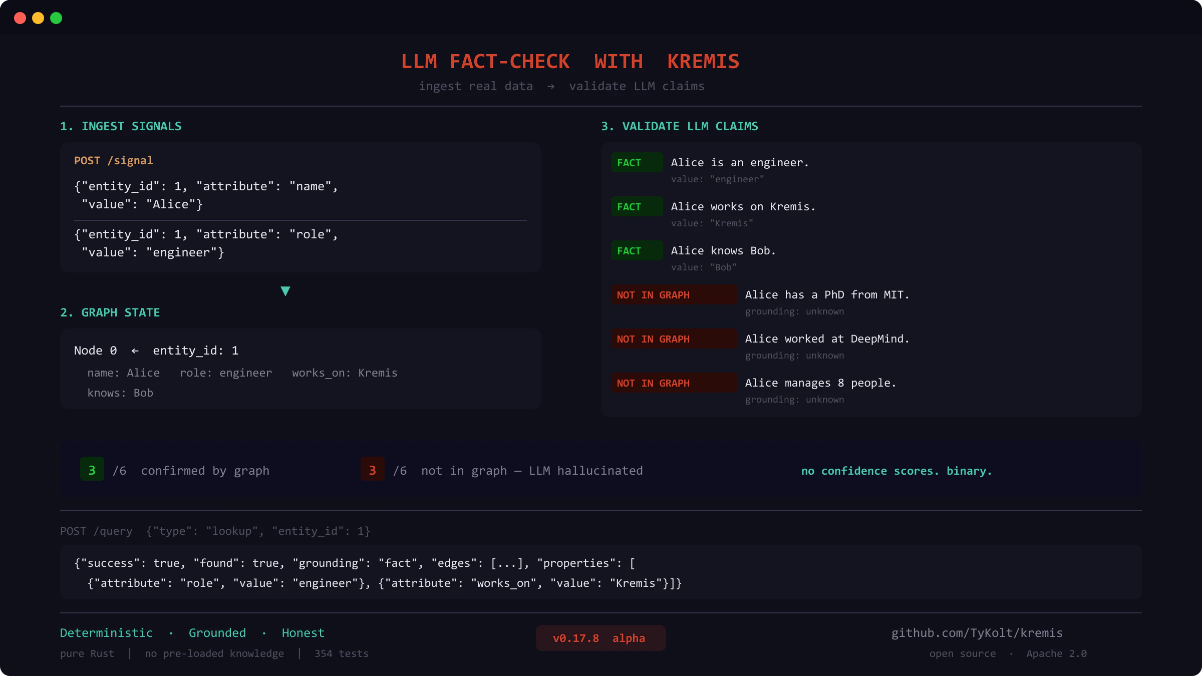 LLM claims validated against real data — never invented. Kremis ingests EAV signals, builds a det...