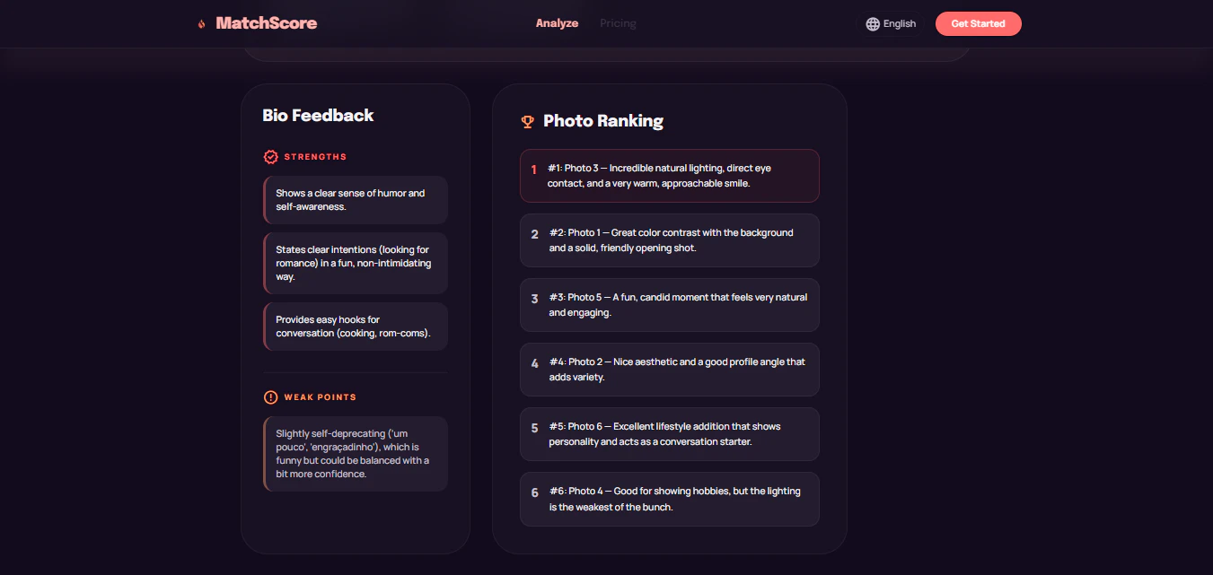 MatchScore analyzes your dating profile in 30 seconds using AI vision Upload your Tinder or Bumbl...