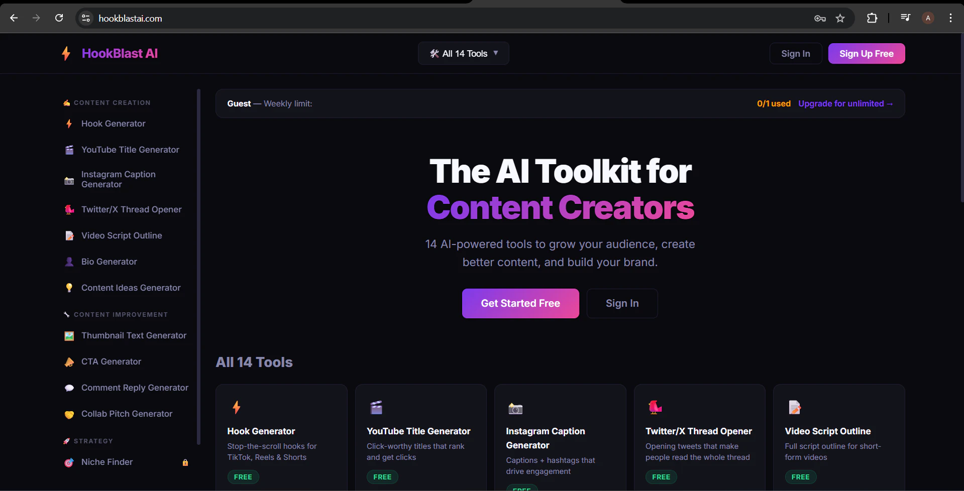 HookBlast AI is an AI toolkit for content creators on TikTok, Instagram, YouTube, and X. 14 tools...