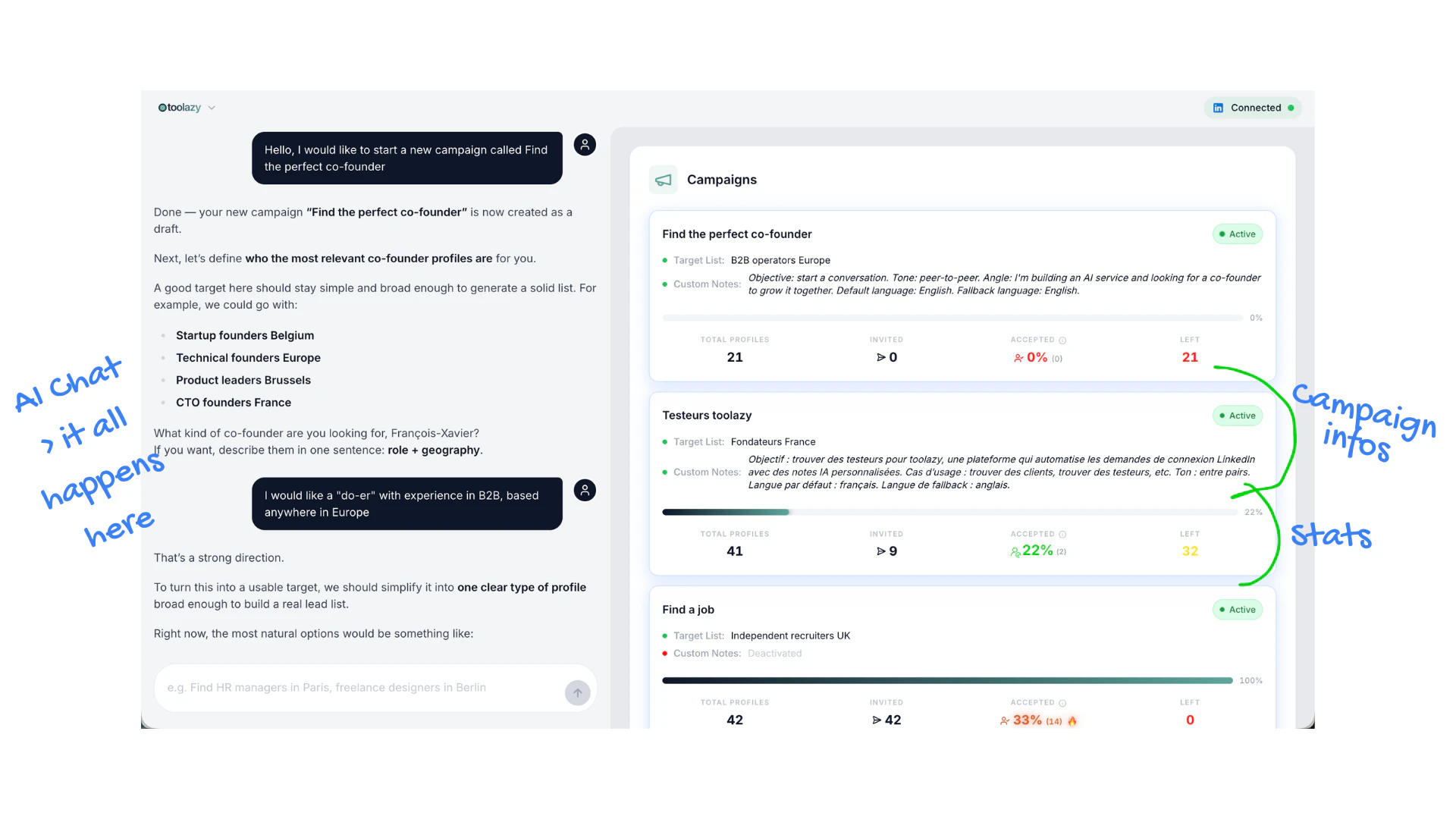 Toolazy sends up to 100 LinkedIn invitations per week, consistently. For each contact, it generat...