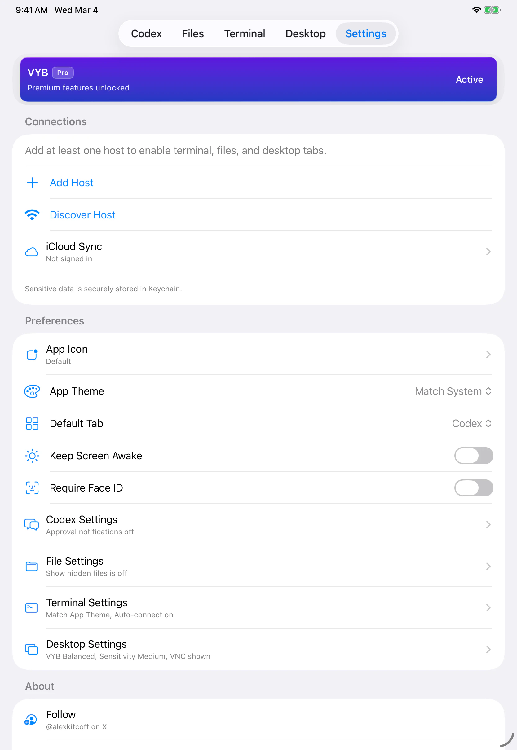 VYB is an iPhone/iPad client for your own Mac workflow. Control Codex, run SSH terminal, browse f...