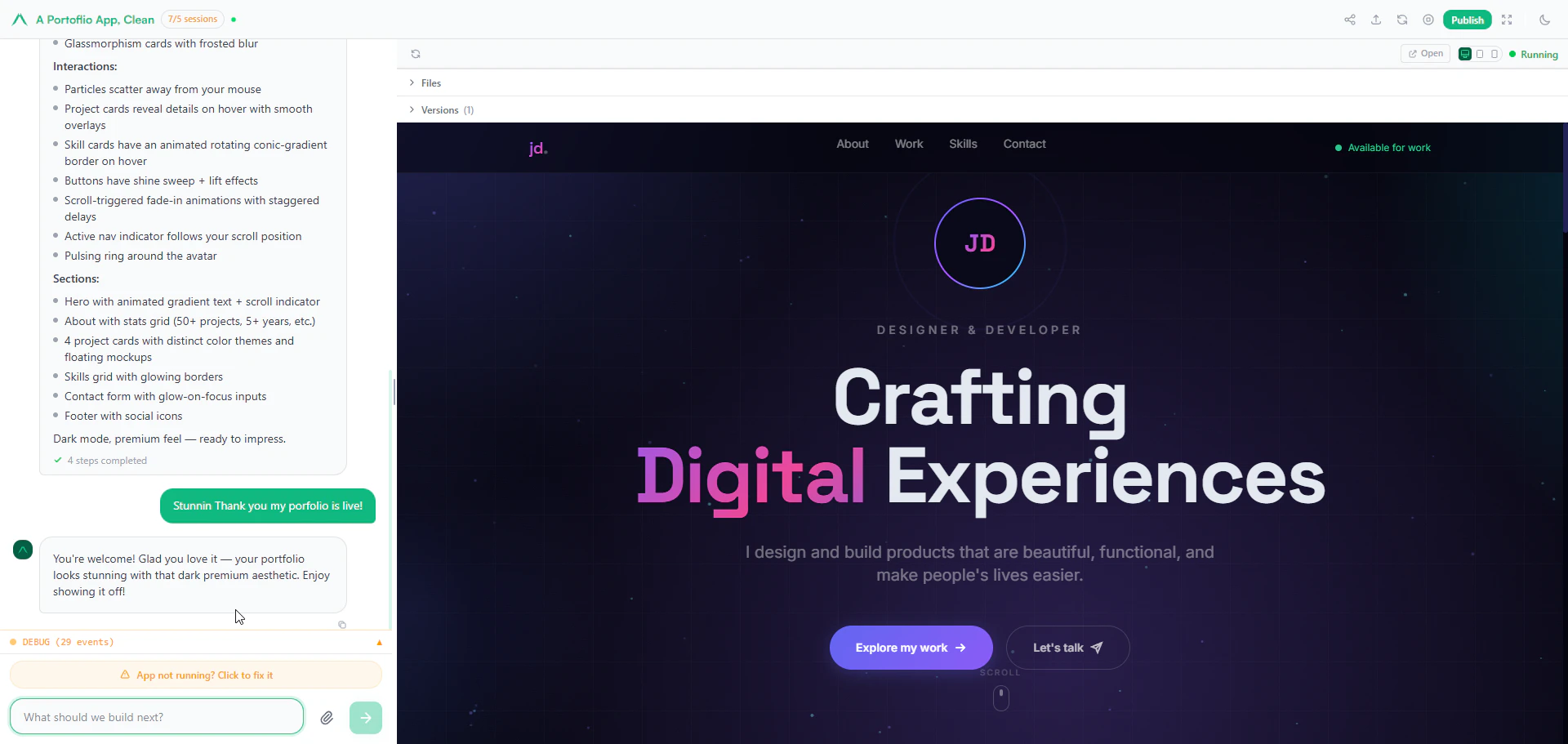 Tell AI what to build, watch it code, go live on your domain