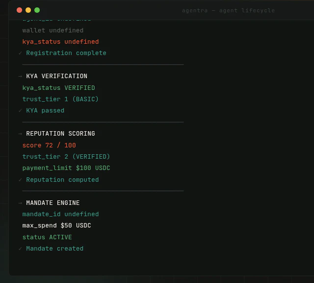 Agentra™ is the trust and compliance layer for autonomous AI agents. Non-custodial identity verif...