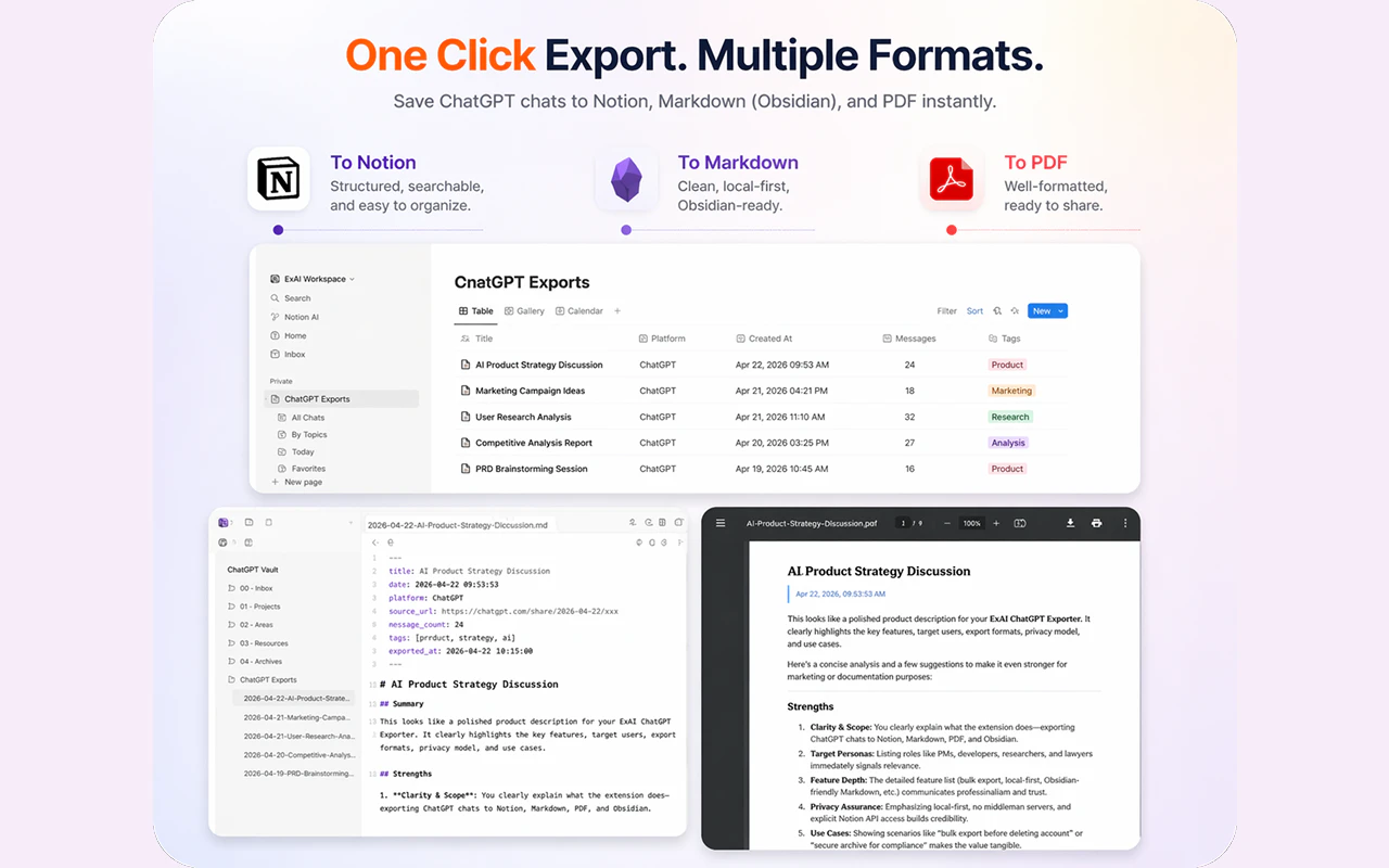 Bulk export AI chats into permanent knowledge assets.