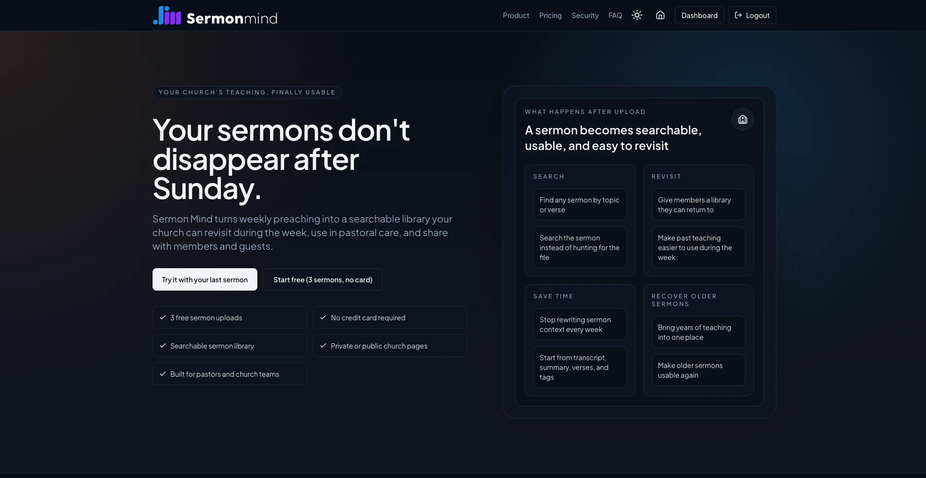 Sermon Mind helps churches turn weekly preaching into a searchable library. Upload a sermon, get ...