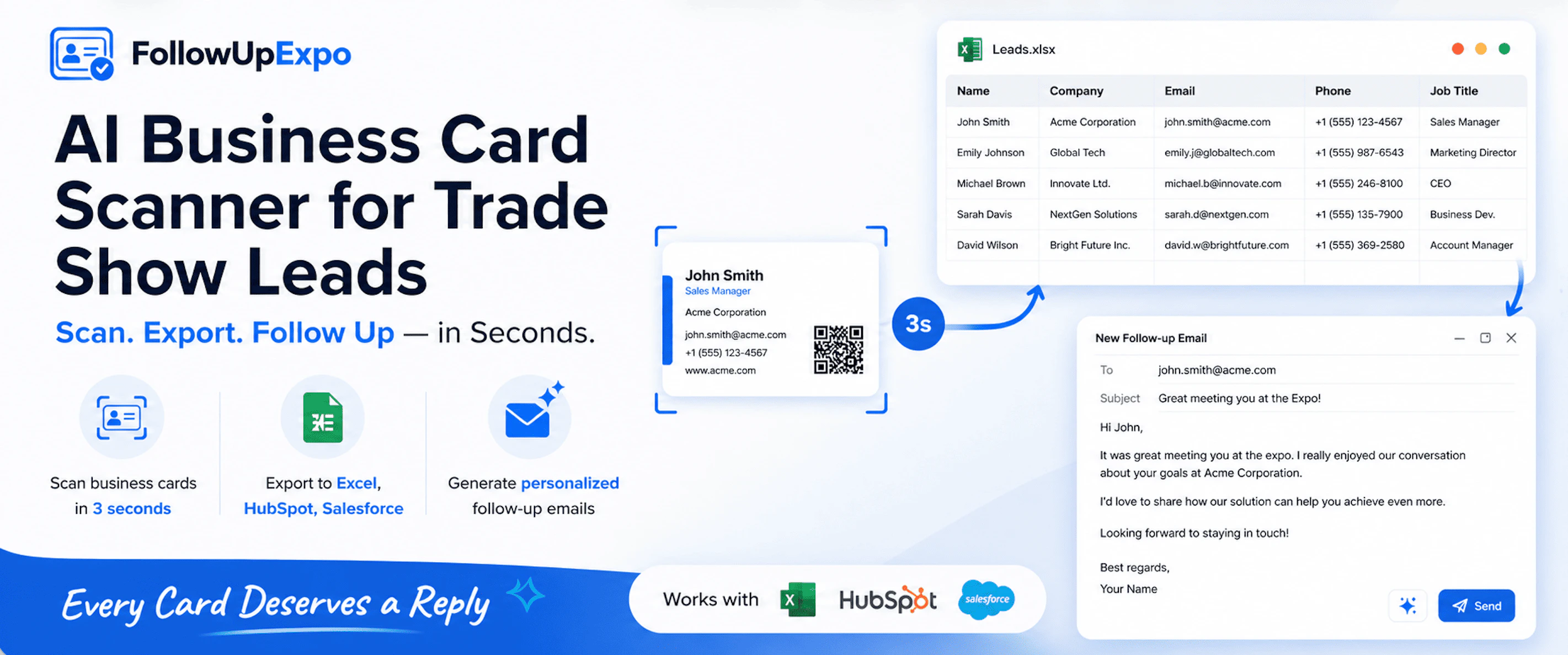 FollowUpExpo turns trade show chaos into CRM-ready leads — instantly. Snap a business card photo,...