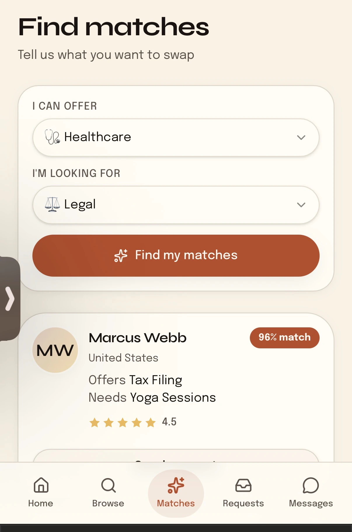Join the AI-powered skill-swap marketplace. Trade what you know for what you need. No money requi...