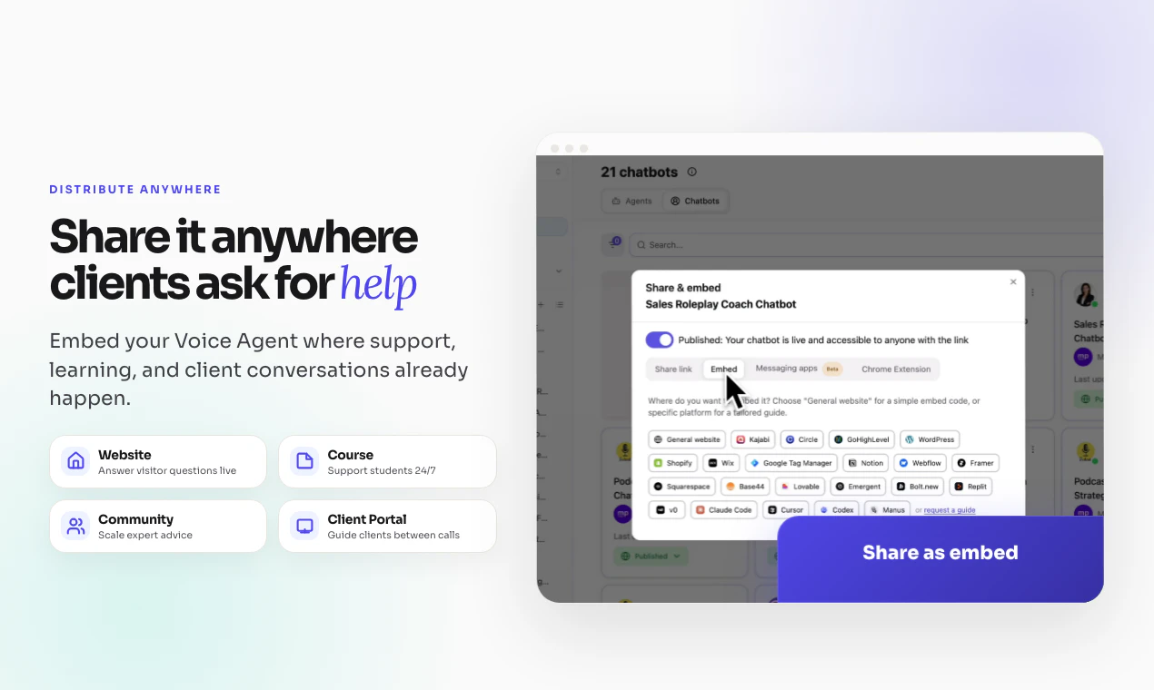 Build client-facing voice agents trained on your expertise. Let clients ask questions, practice c...