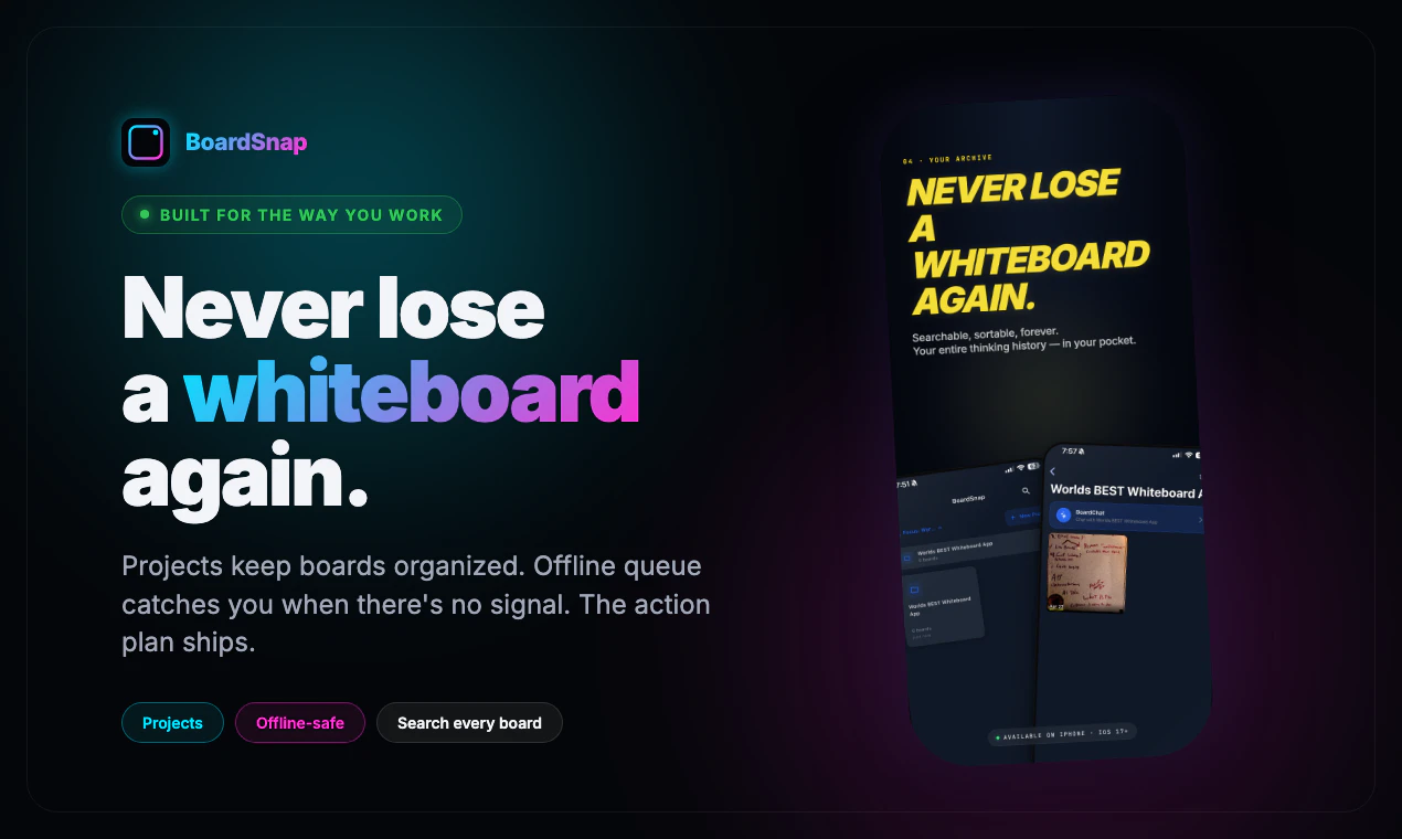 Snap any whiteboard — classroom, boardroom, coffee-shop napkin. BoardSnap straightens it, reads e...