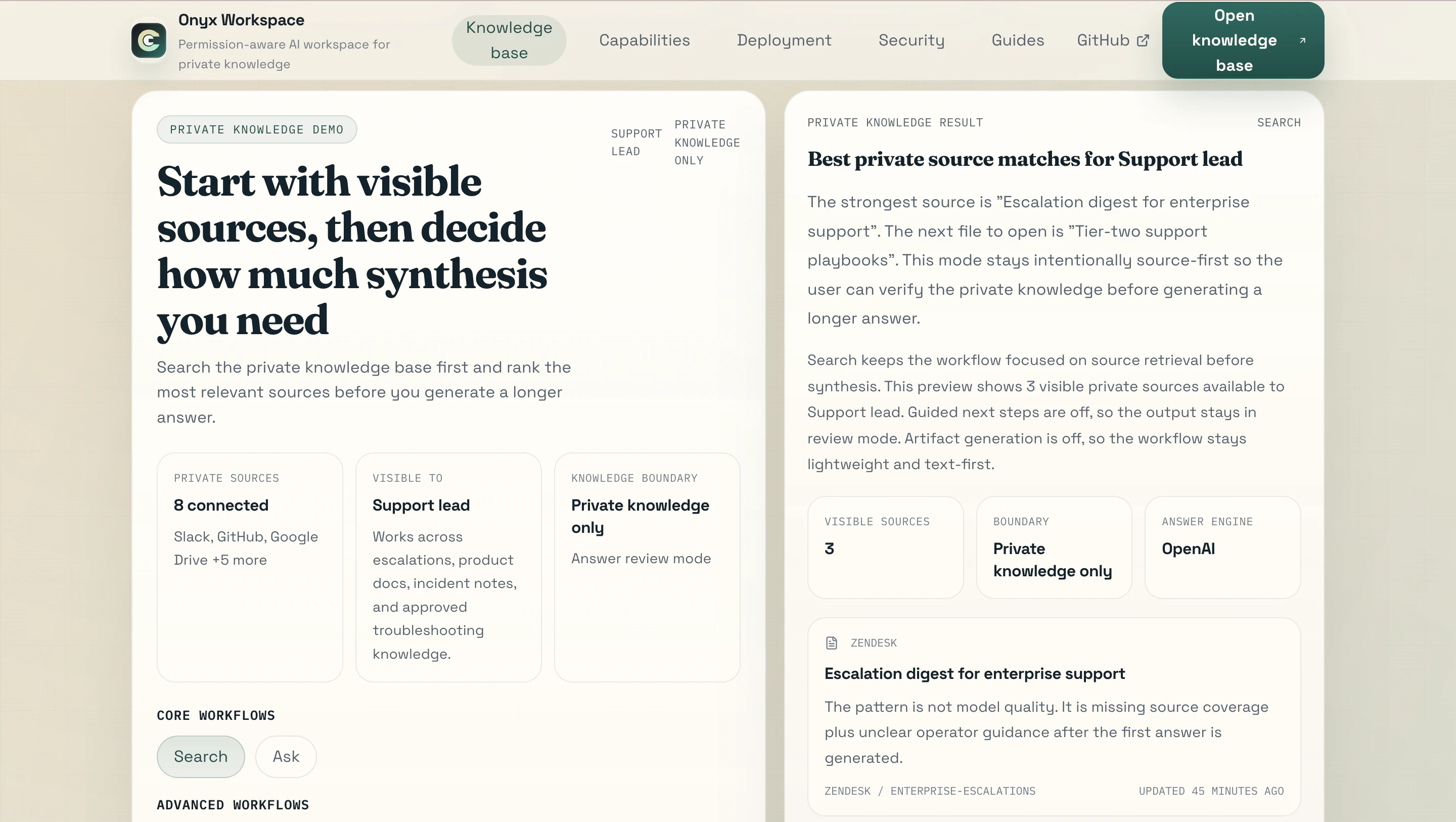 Onyx transforms docs, tickets, code, chat, and policy pages into a permission-aware knowledge lay...