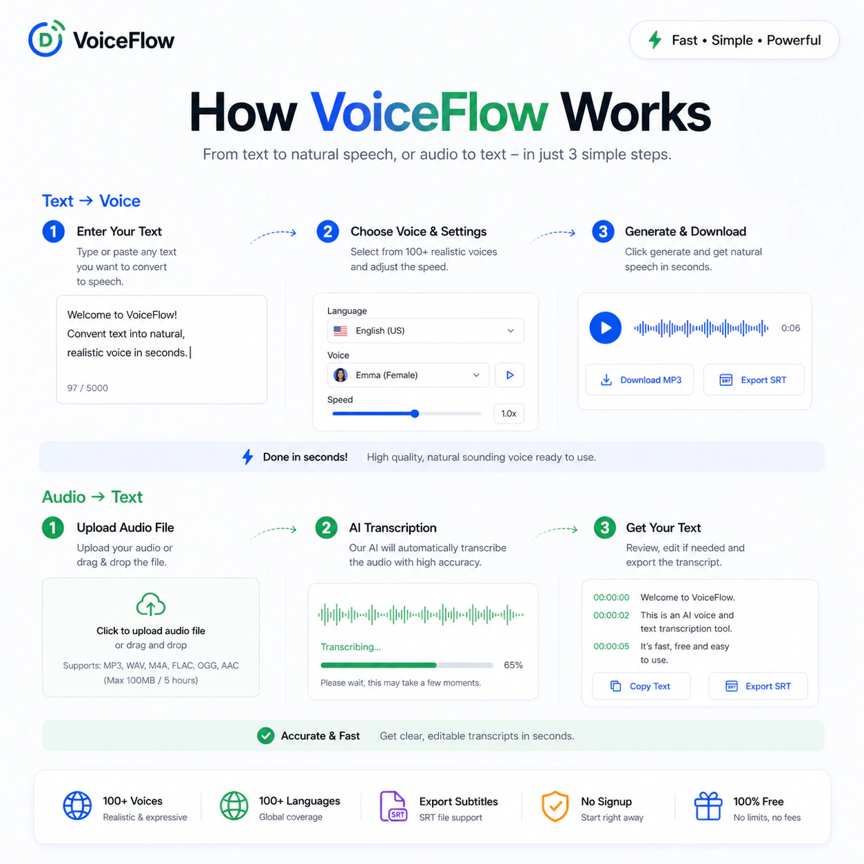 VoiceFlow makes it easy to convert text into natural-sounding speech and transcribe audio into te...