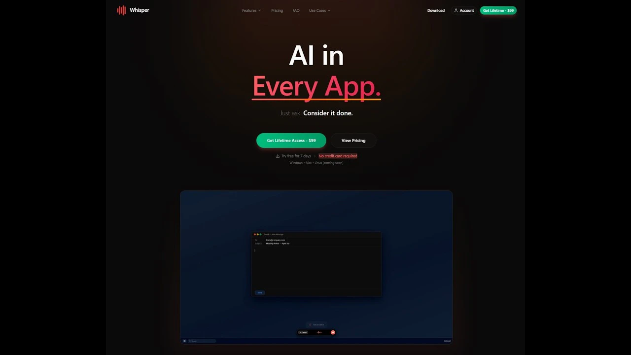 Just ask. Consider it done. Whisper is a desktop AI that lives in every app on your computer. Spe...