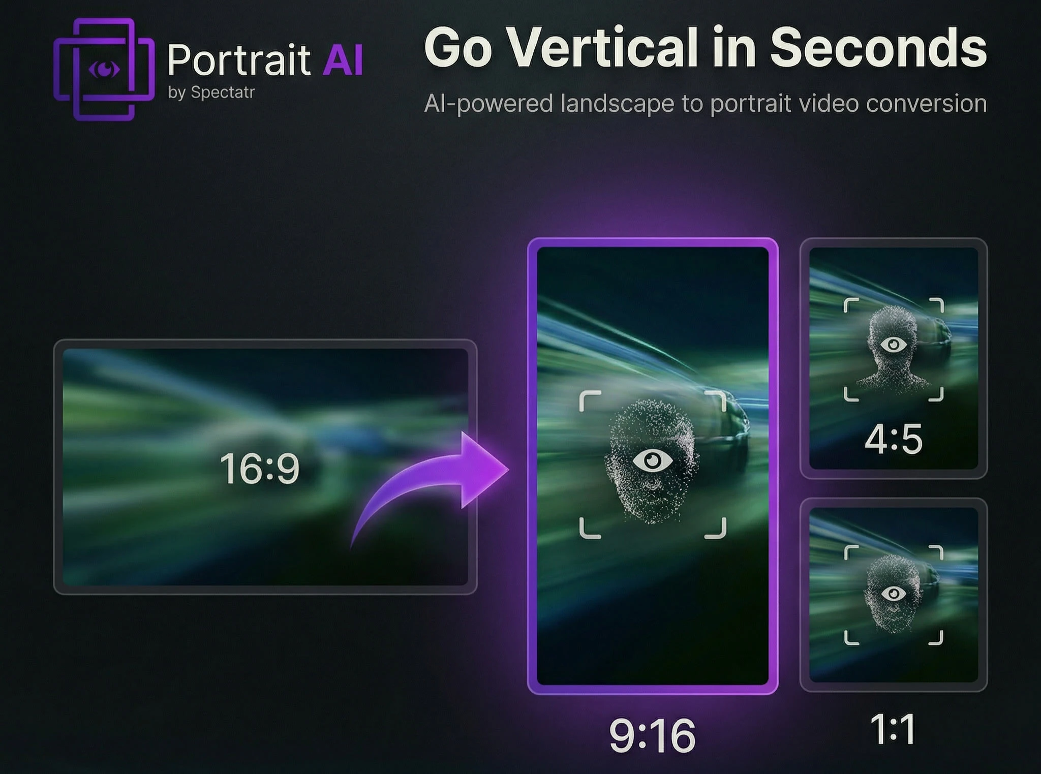 Convert any landscape video to portrait 9:16, 4:5, or 1:1 in under 2 minutes. AI subject tracking...