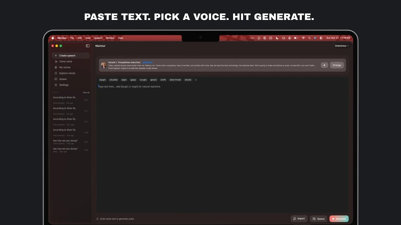Murmur is a local-first macOS voice studio for Apple Silicon. Unlike ElevenLabs or Speechify, eve...