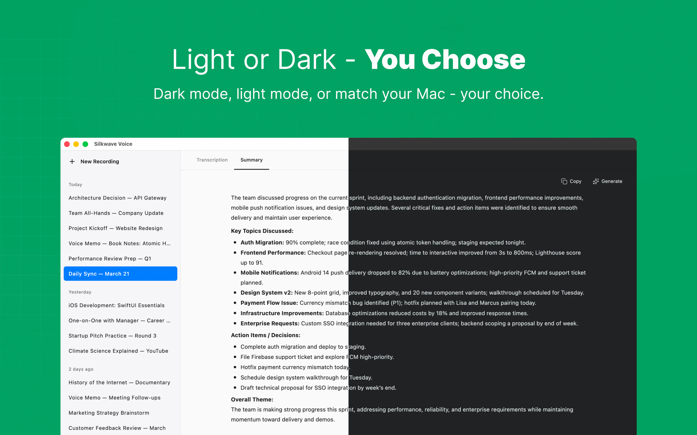 Silkwave Voice records your microphone, system audio, or both simultaneously. Transcription runs ...