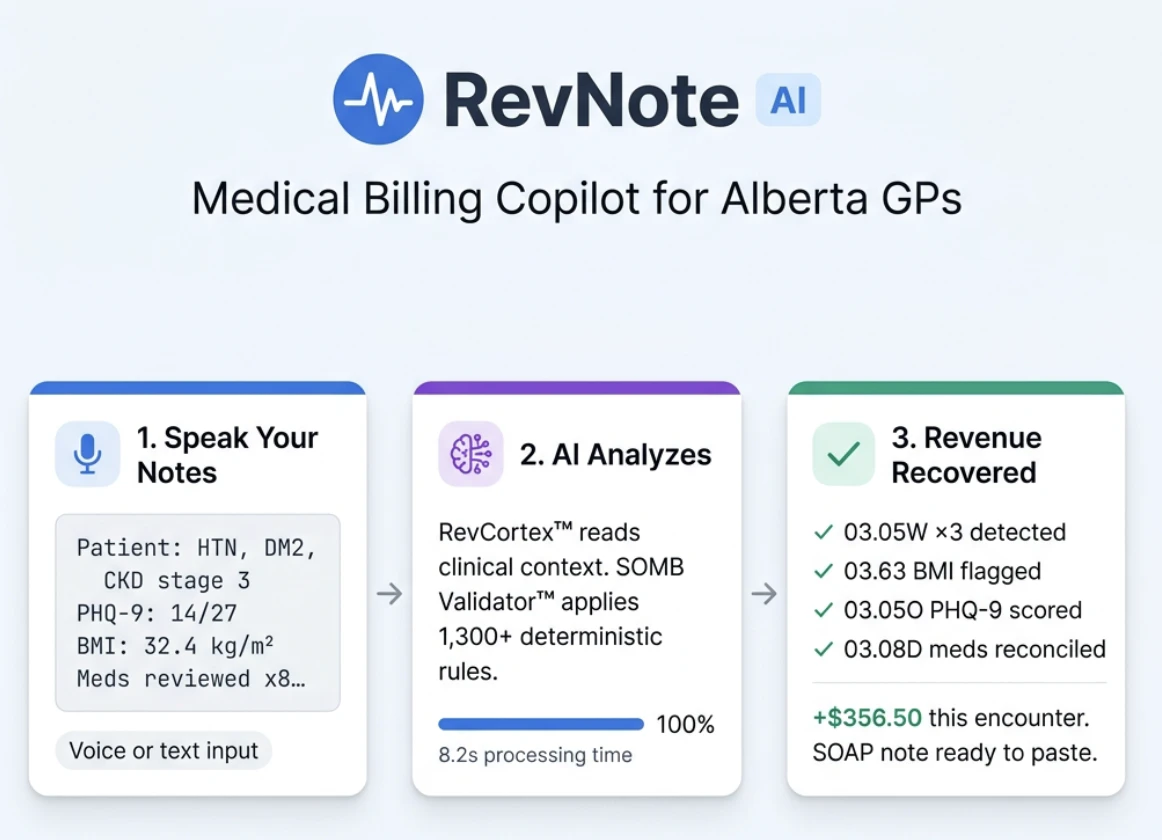Alberta GPs leave $33,600/year in unclaimed SOMB billing codes. RevNote AI fixes this in <10 seco...