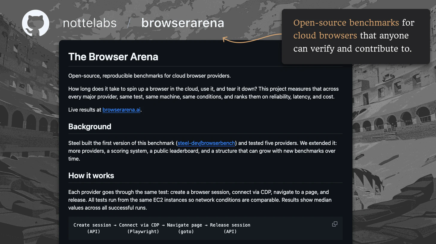 Browser Arena is an open-source benchmark that tests 7 cloud browser providers on speed, reliabil...