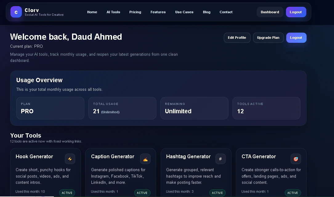 Clorv helps creators, coaches, marketers, and brands generate hooks, captions, hashtags, scripts,...