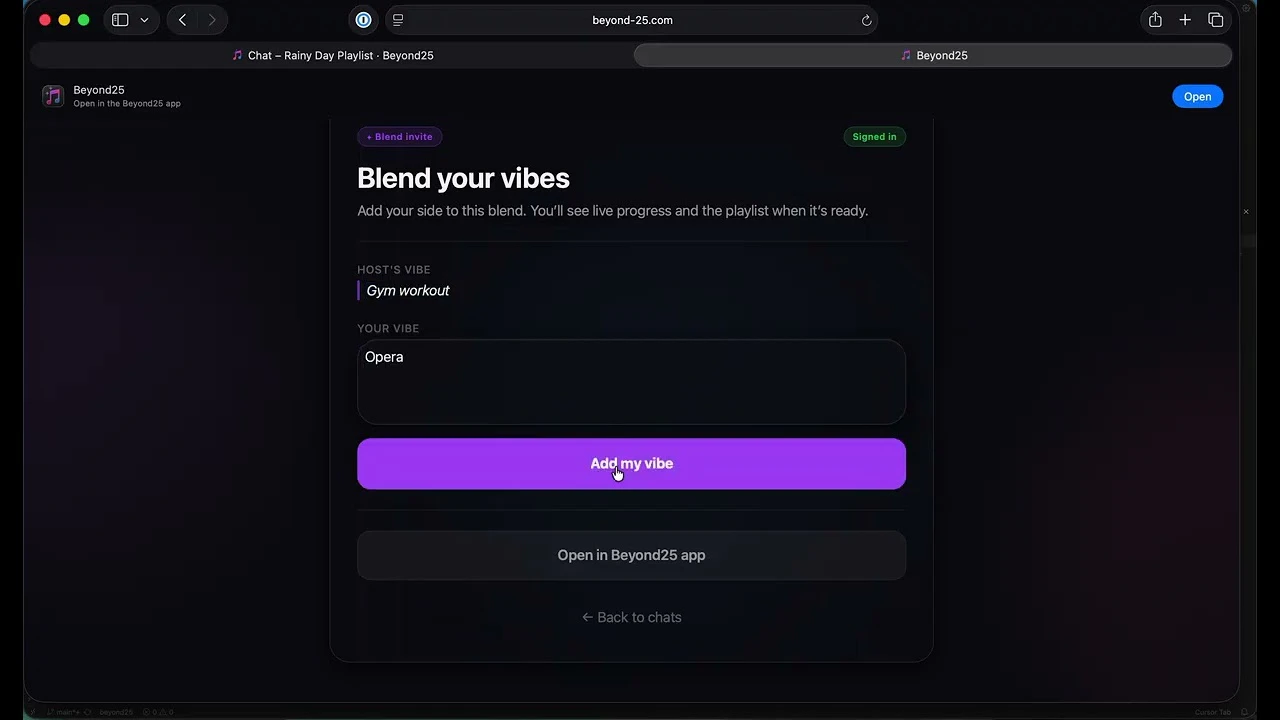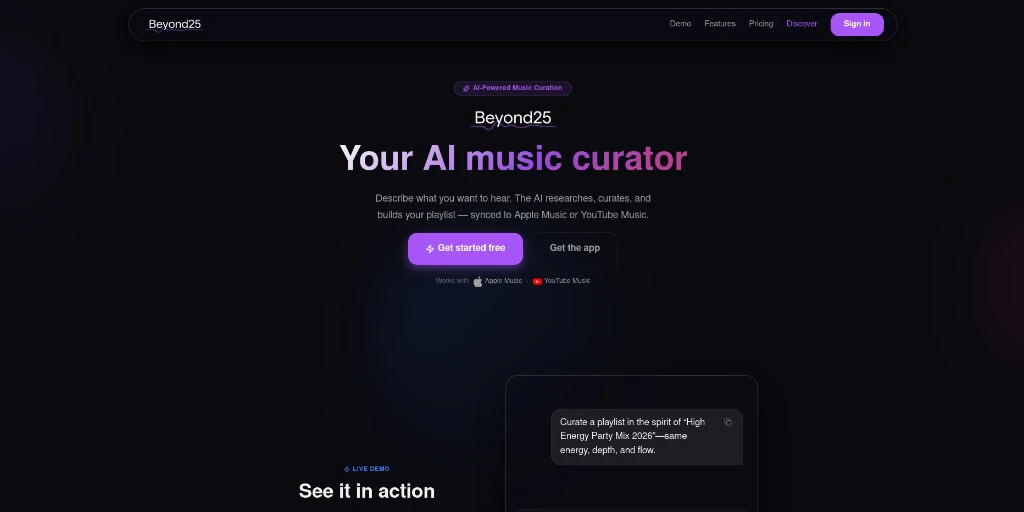 Describe a mood, era, artist, or vibe — Beyond25 researches it and builds a real playlist, saved ...