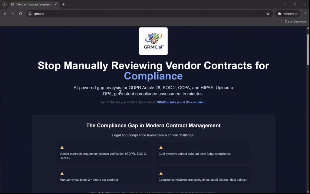 ## 概要 - GDPR第28条・SOC 2・CCPA/CPRAの遵守ギャップを契約書から検出するAI分析ツール。契約をアップロードすると即時のギャップ分析と是正提案を返します。20年以上の法務...