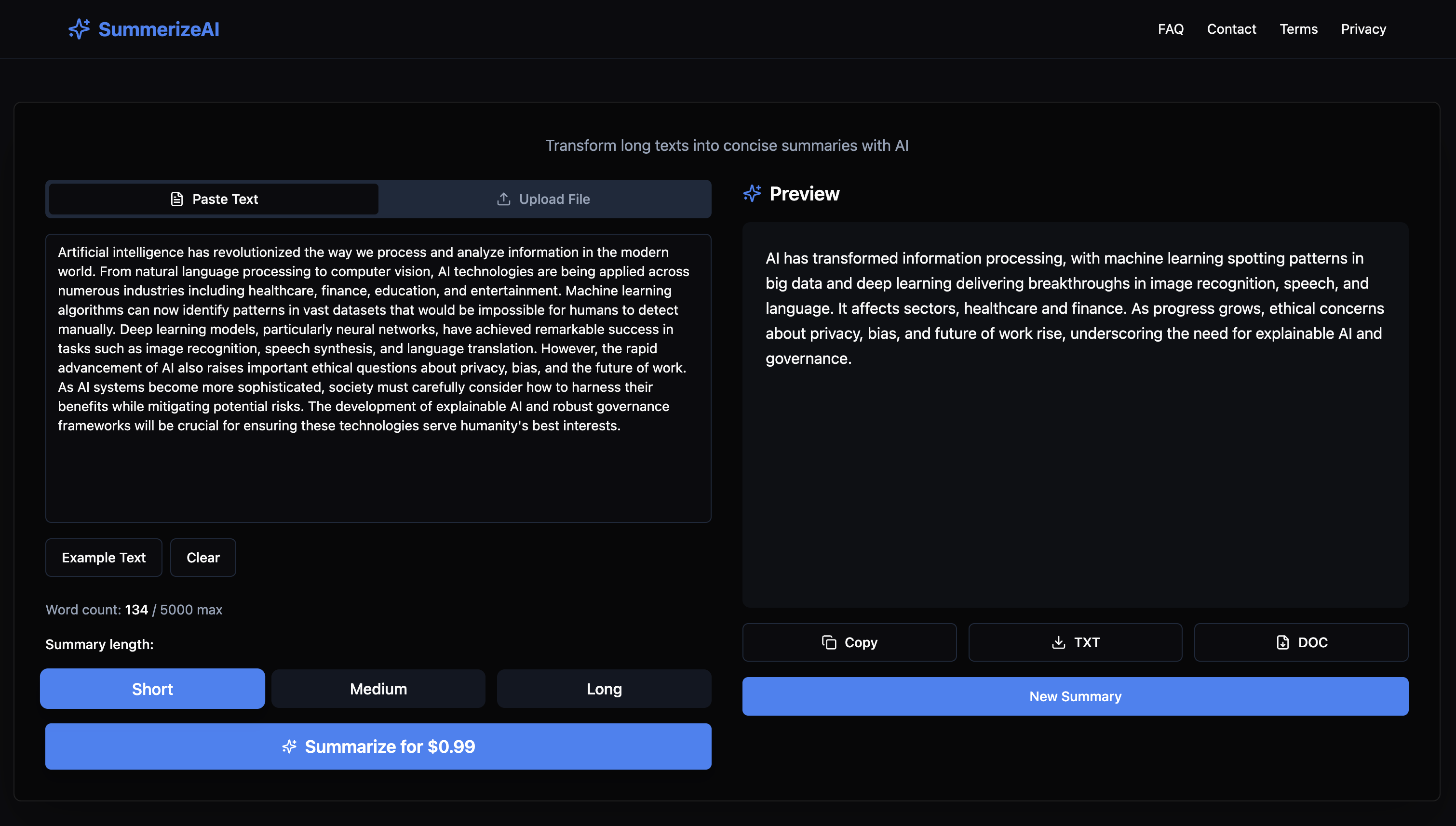 任意のテキストや文書を瞬時に要約。要約1件につき99セント。