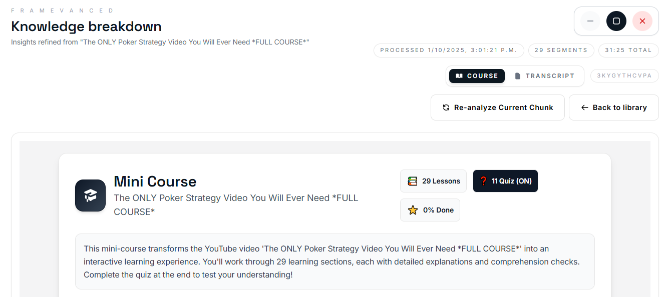 ## 概要 このアプリは、YouTubeの動画を短いミニコースとして変換し、ユーザーがより効率的に学べるように設計されています。投資時間を短縮しつつも、質の高い学習体験を提供することを目指してい...