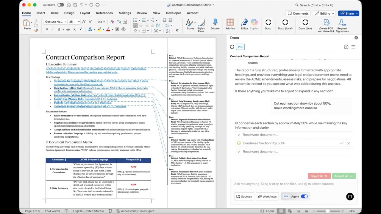 ## 概要 Doco Agent ModeはWord内で直接編集できる自律AIエージェントです。変更履歴を有したままドラフト作成からフォーマットまでの全ワークフローを、逐次実行します。 ## ...
