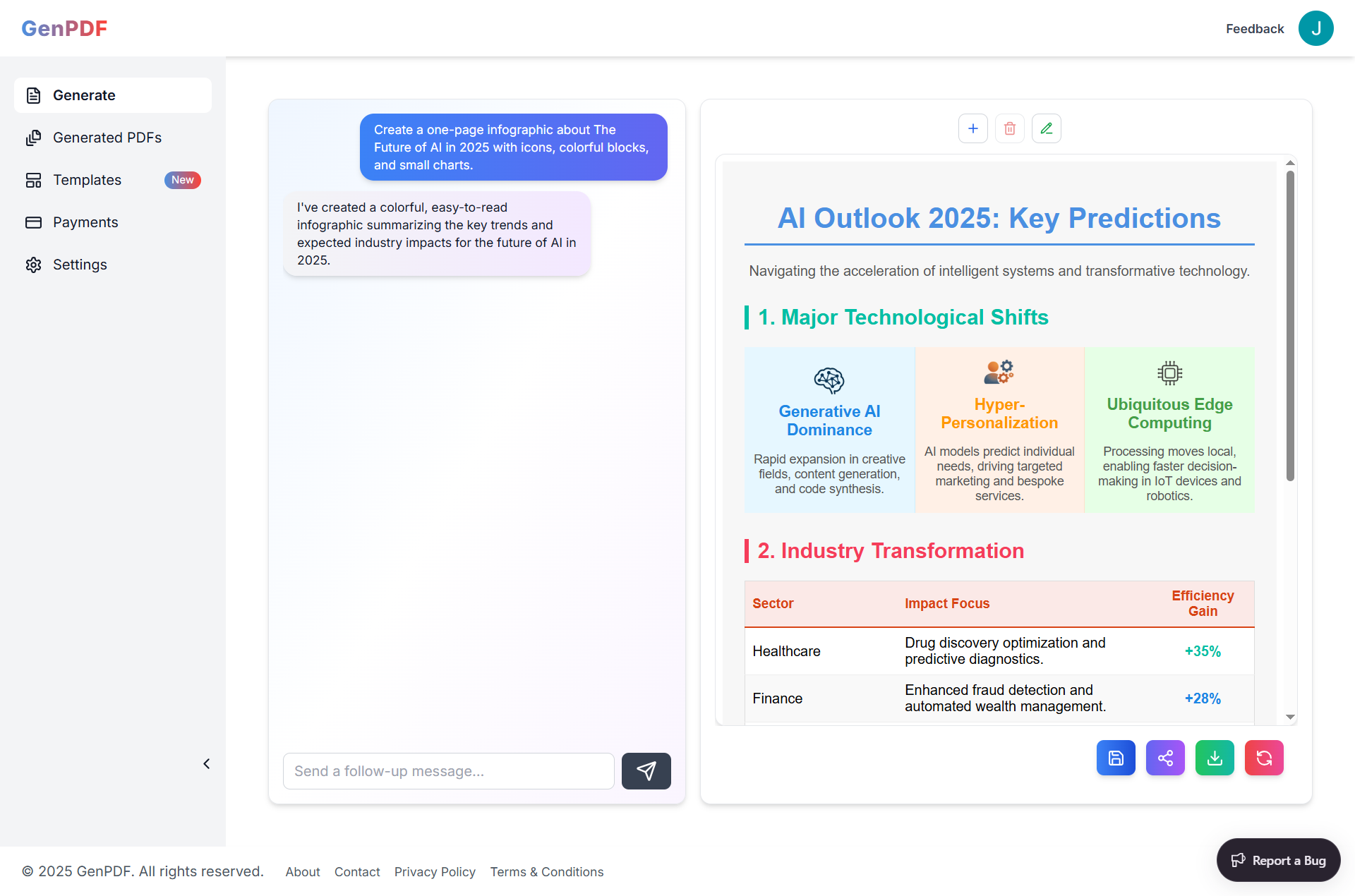 GenPDFはAIを活用してPDFの生成・編集・変換を高速化するツールです。あらかじめ用意されたテンプレートを使えば、ノート・請求書・レポート・履歴書・手紙などを瞬時に作成できます。学生・教師・...
