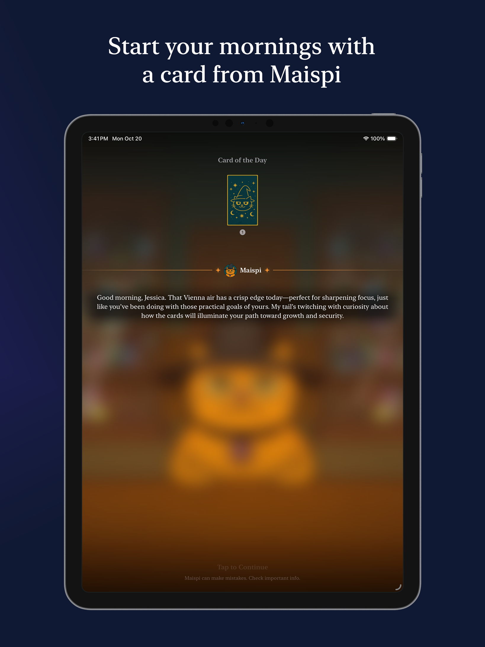 ##製品概要 Maispi は猫のタロットリーダー。物語やパターンを読み取り、実体験に基づくリーディングを提供します。 テンプレート解釈やウェルネス系の演習ではなく、ディスカッションを通じて深掘...