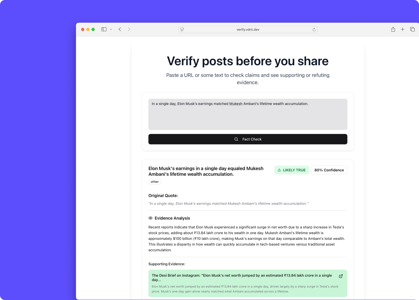 Verifyは、数秒でオンラインの拡散メッセージの真偽を検証するツール。信頼できるソースでも見た目次第で誤情報が広がる現状を踏まえ、証拠と文脈を提示して判断を促します。 ## 特徴 - 簡単操...