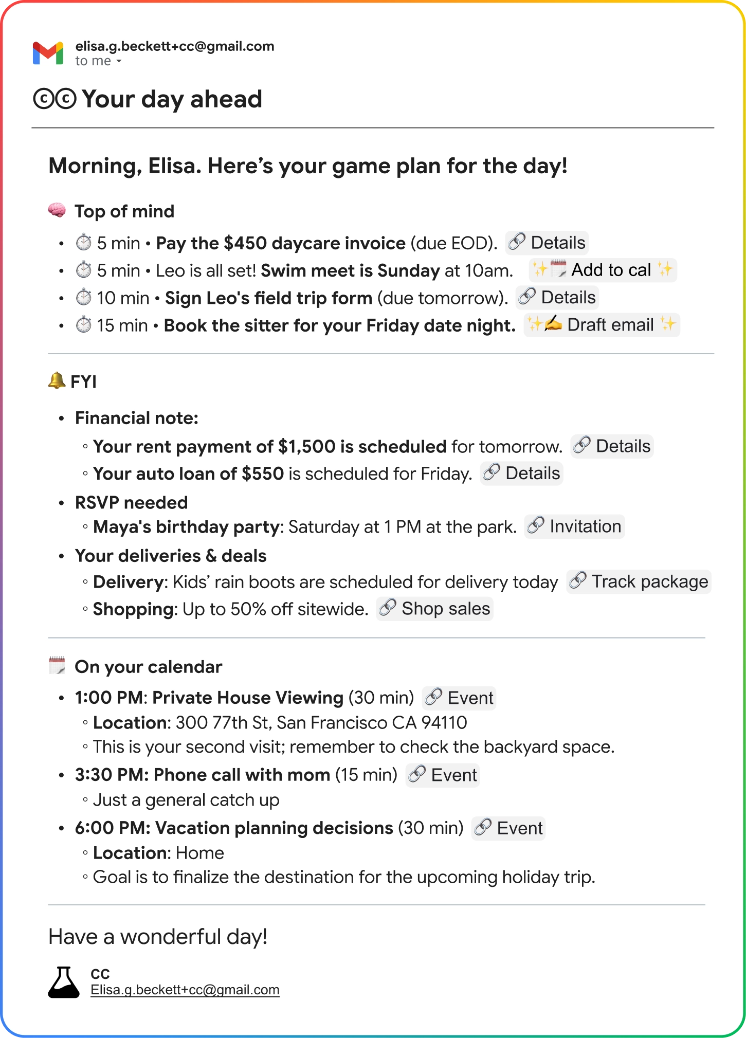 Google Labs の実験的AI生産性エージェント「CC」は、Gmail・カレンダー・Driveと連携して、毎朝の“Your Day Ahead”ブリーフを提供。メール上での返信ドラフト作成...