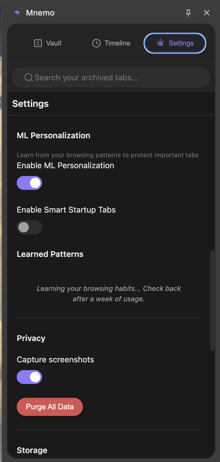 MLを活用したパーソナライズ型タブアーカイブ。100%ローカル保存、トラッキングなし、クラウド同期なし。即時TF-IDF検索、ワンクリック復元、タイムライン表示を搭載。Chrome/Edge/B...
