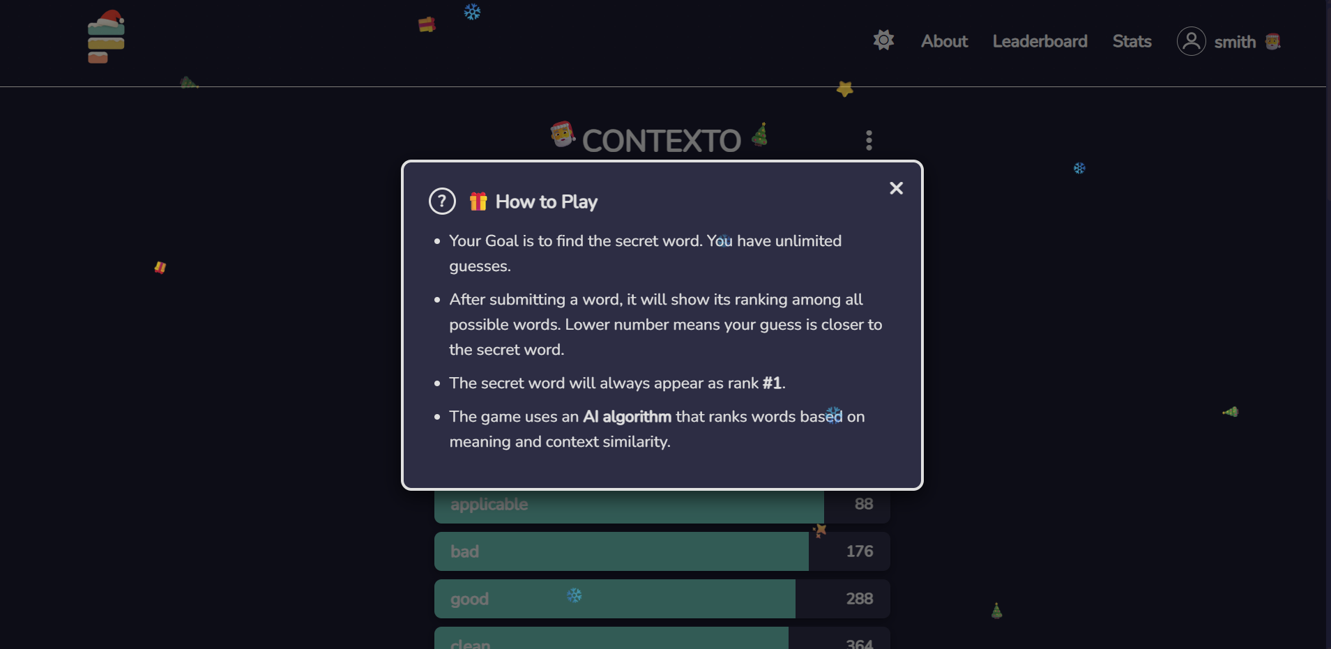 Contexto — a daily semantic word-guessing game. Submit words to discover the secret word using AI...