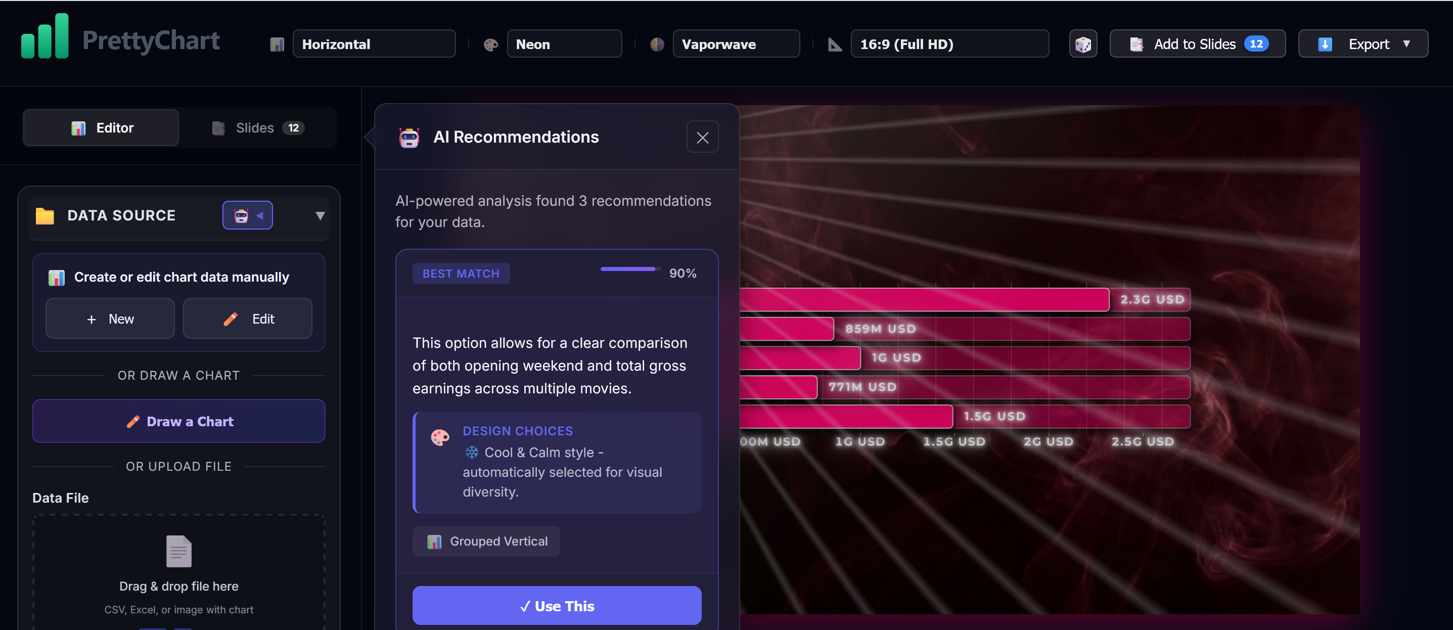 Pretty Chartは、ブラウザ上で動くデザイン重視のデータ可視化ツール。4つのデータ取り込み方法、18チャート、KPIカード、スライドデック作成、PDF/SVG/PNG出力を1つの統合ツー...