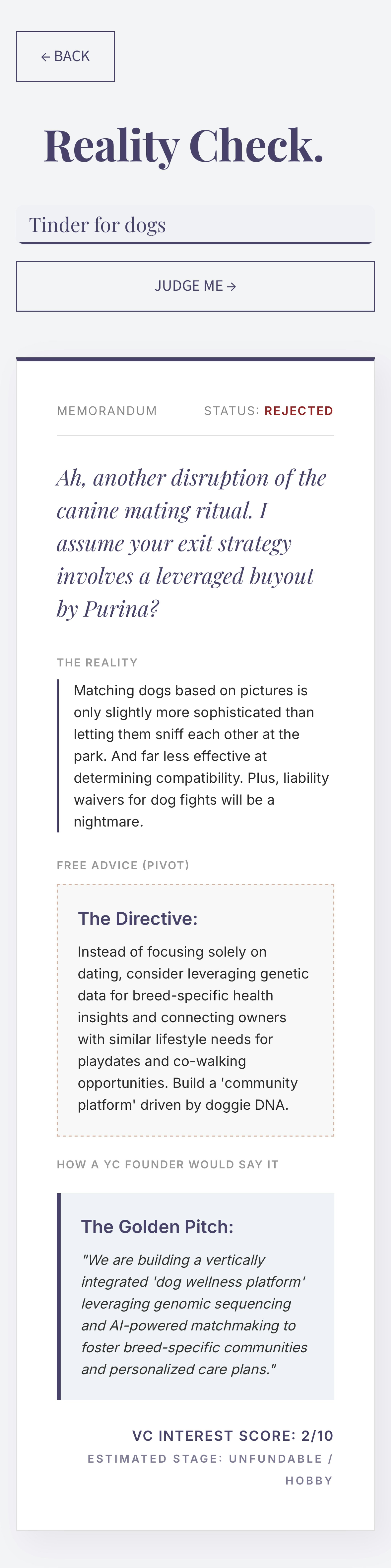 Reality Checkはプレシード前の合理性チェックをAIで行うツールです。タグラインどおり、AI投資家にアイデアを徹底批評してもらい、即時分析・VCペルソナ・採点機能でアイデアの実現性を0...