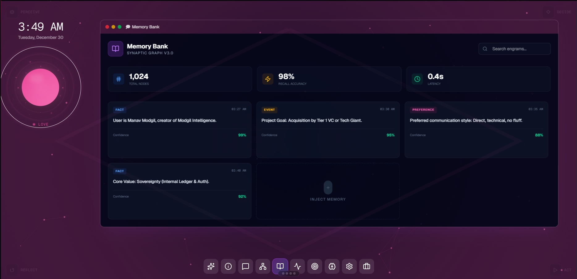 ## 概要 9つの連携アプリから成る認知エンティティOS。信念・推論過程・記憶をリアルタイムで透明化し、監査と統治を可能にする点が特徴です。 ## 主な特徴 - Mind/Memory Gra...