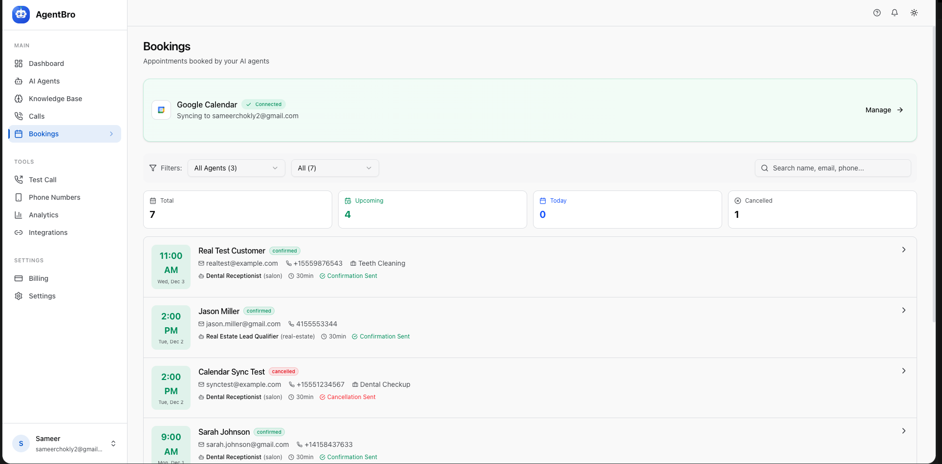 ## 概要 AgentBroは24/7で電話応対するAI受付です。自然な声で応答し、予約を自動で取り、Googleカレンダーと同期します。リード情報を取得して要約を通知します。 ## 主な機能...