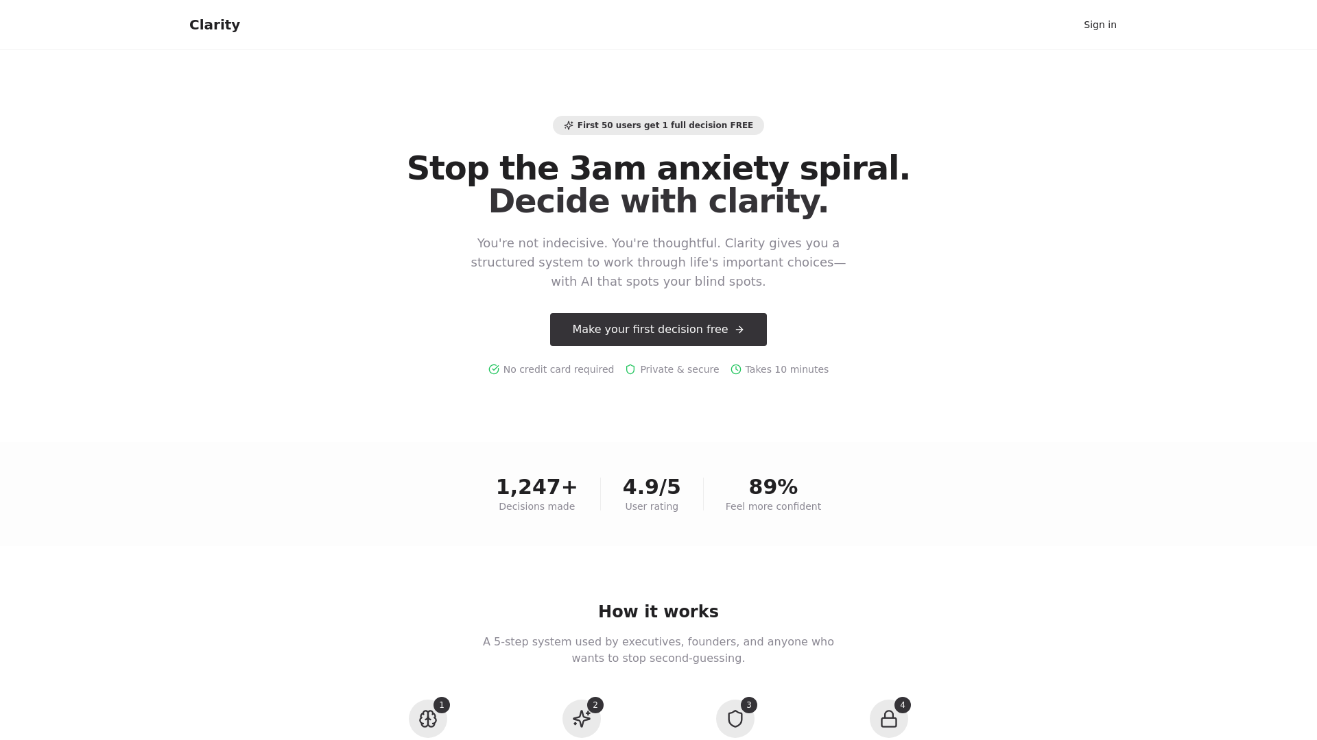 ##概要 決断を先送りしがちな人のための意思決定支援アプリ。分析と比較を通じて、時間任せにせず「明瞭さ → 選択」を促します。 ##特徴 - 思考を止めず、選択のプロセスを前進させる - 生産...