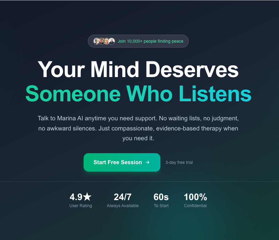 MarinaはCBTに基づくリアルタイムAIセラピーアシスタントです。機密性が高く判断を求めず、24時間365日いつでも対話を提供します。エビデンスに基づくCBT手法を用い、過去のセッションを記...