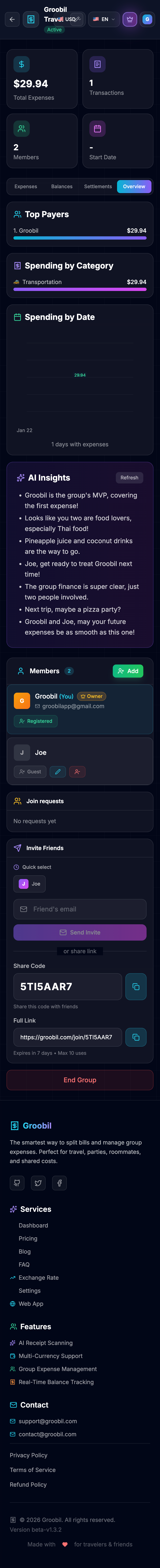 ## 概要 Groobilは、旅やグループのためのスマートな共同経費トラッカー。経費を数秒で追加し、等分またはカスタム比率で分割。誰が誰にいくら支払うべきかの明確な提案を表示して清算を最適化しま...