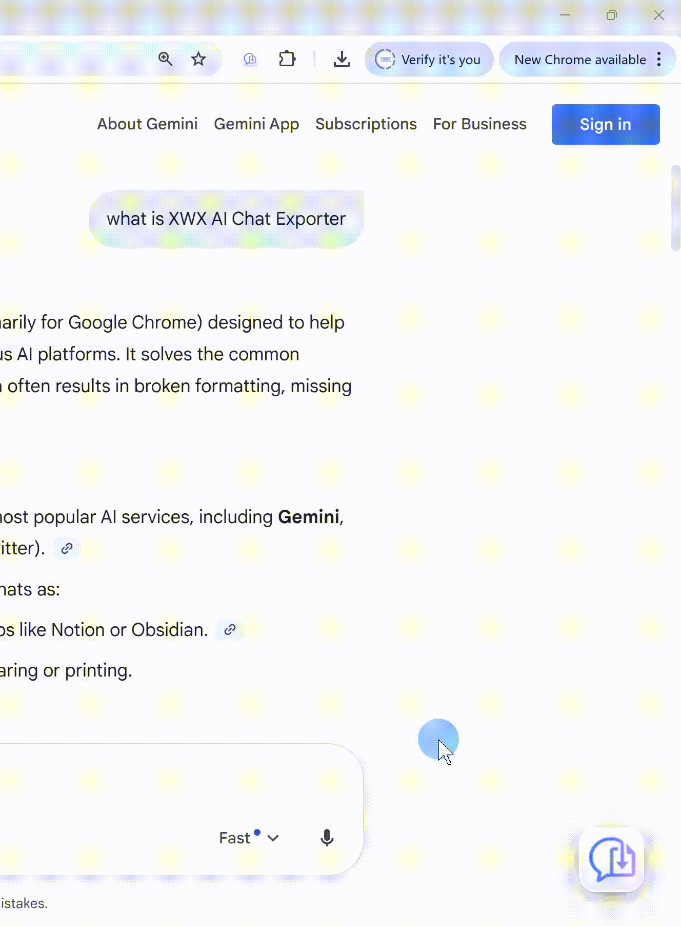 XWX AI Chat Exporterは、ChatGPT・Claude・Gemini・Grok・DeepSeekの会話を手作業のコピー不要でPDFおよびMarkdownとして保存できる拡張機能...