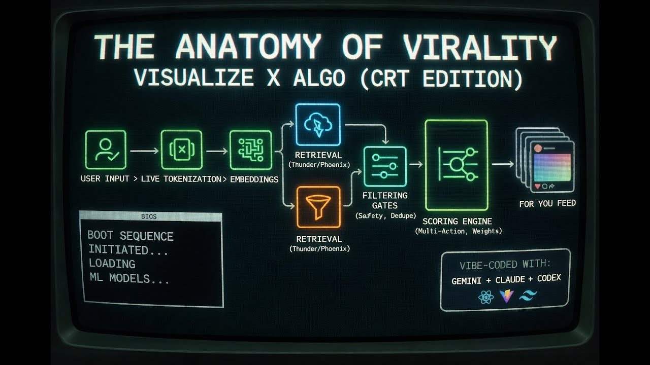 ## 概要 X のアルゴリズムを CRT 風に可視化するインタラクティブなデモ。ユーザーが「Tweet」ボタンを押すと、ツイートが X のインフラをどの順序で通過して推奨に反映されるかを、視覚的...