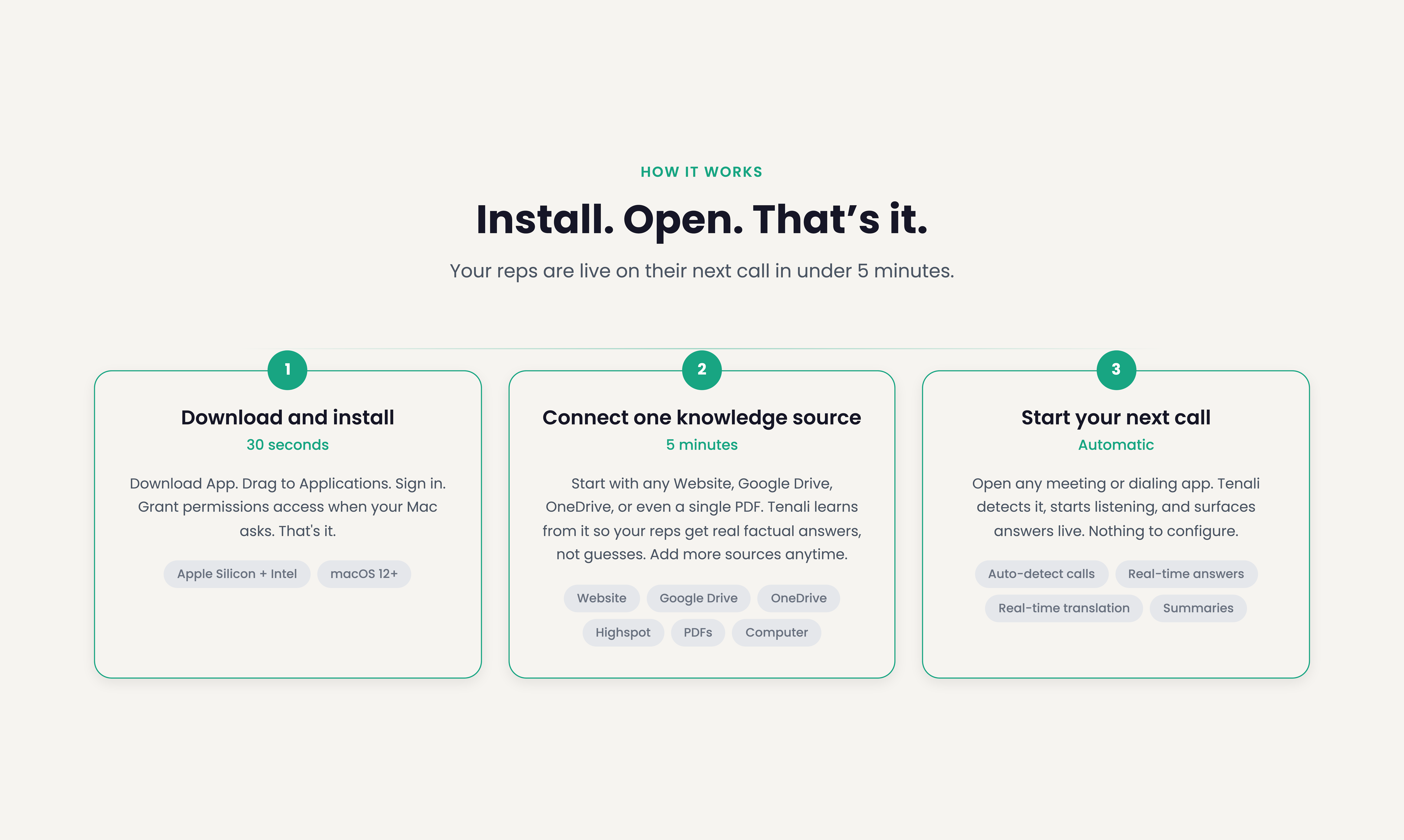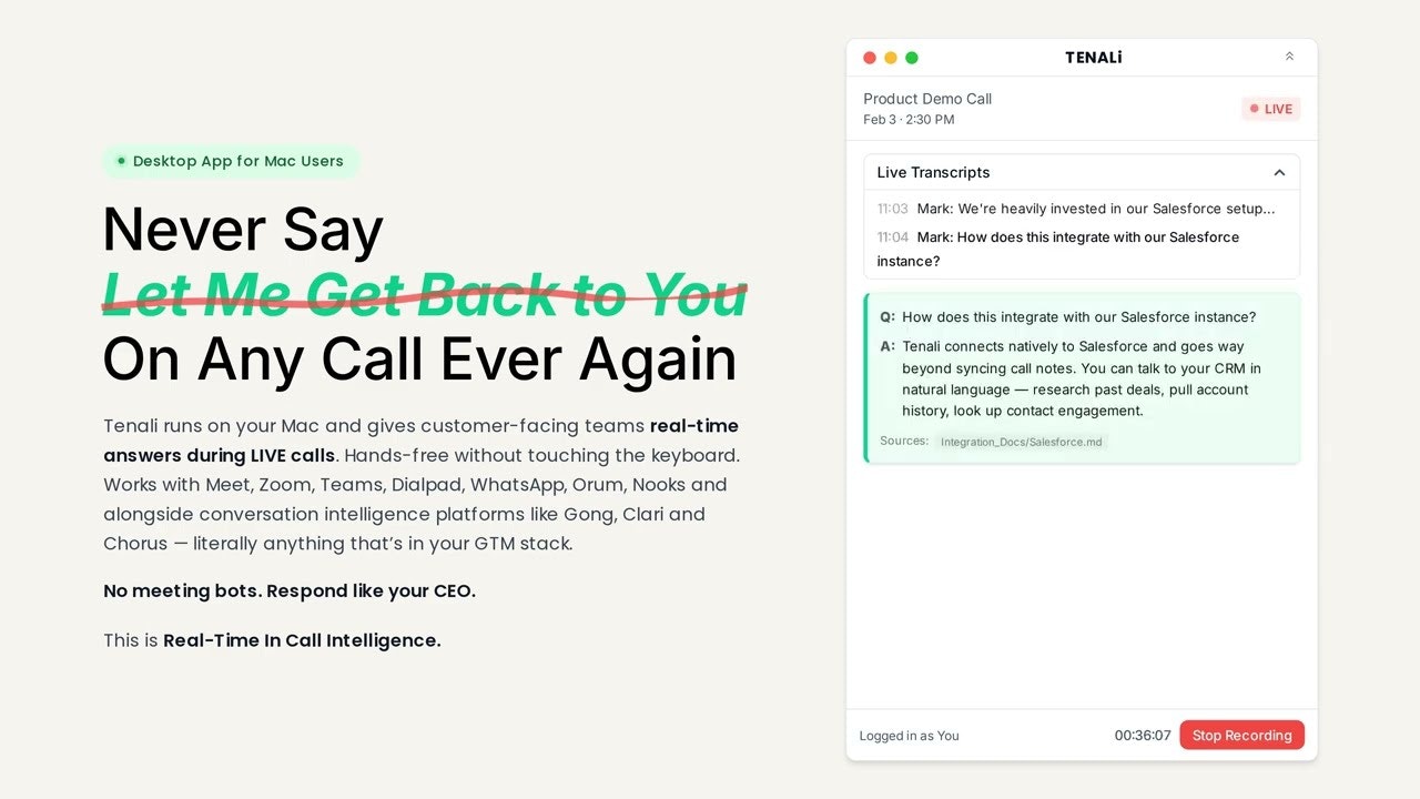 ## 概要 Tenali AI DesktopはMac専用のネイティブアプリで、商談中の通話をリアルタイムに聴取し、顧客の質問が及ぶ前に自社ナレッジベースから正確な回答を画面に表示します。100...