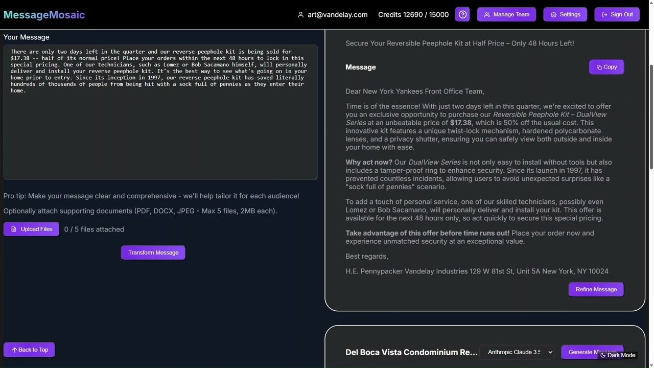 ## 概要 MessageMosaicは、AIの得意領域を活かしつつ、従来の「1つずつ生成」という制約を超えるツールです。事前にオーディエンスプロファイルを作成し、各層の好みを設定することで、複...