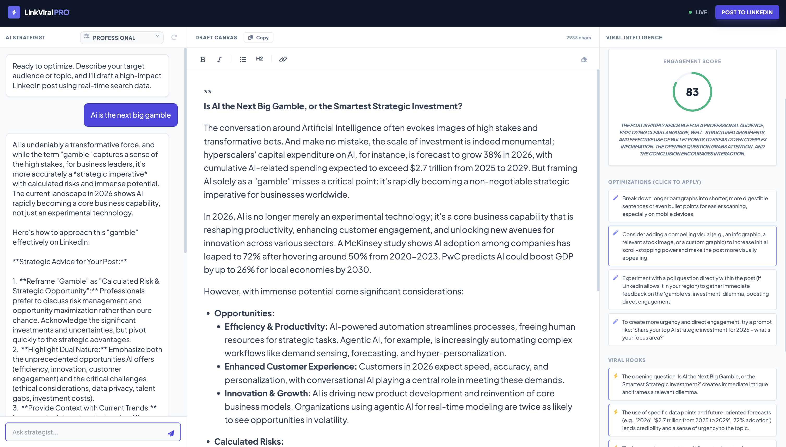 ## 概要 LinkViralProはLinkedIn投稿を自動で書くAI。退屈なコピーではなく、読み手の目を止めて考えさせる投稿を数秒で生成します。アイデアを洗練させ、ロボット感を排除して賢く...