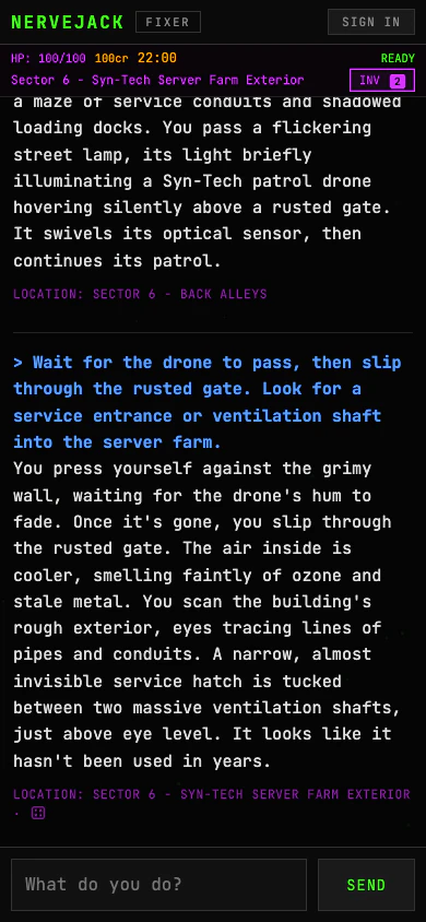 A free text-based RPG set in a cyberpunk mega-city. Type what you do — a game master responds. No...